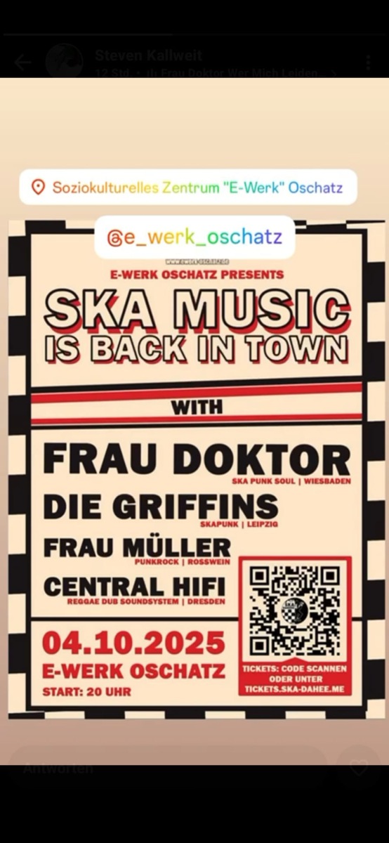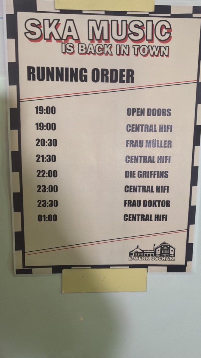 Am 4.10.2025 hatten wir die Ehre, in Oschatz, dem legendären E-Werk aufzubauen. Matti BigMan und Manu Ruff haben mit einer fein ausgewählten Ska, Rocksteady und Reggae Vinyl Selection für die musikalische Unterhaltung vor, zwischen und nach den Konzerten gesorgt.